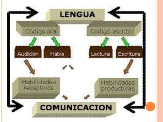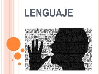 Este documento presenta información sobre el lenguaje y su relación con el pensamiento desde diferentes perspectivas teóricas. Explica que el lenguaje se puede comunicar de diversas formas como la voz, los gestos, la escritura y más. También describe las etapas del desarrollo del lenguaje en los niños, los tipos de lenguaje, posibles trastornos, y componentes no verbales de la comunicación como la mirada y los gestos. Finalmente, introduce brevemente la programación neurolingüística y sus orígenes.