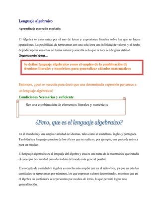 El documento presenta una introducción al lenguaje algebraico, definiendo conceptos como variable, expresión algebraica y términos semejantes. Explica las diferencias entre el álgebra y la aritmética y cómo se usan las letras para representar cantidades desconocidas. Muestra ejemplos de cómo expresar relaciones numéricas y resolver problemas usando ecuaciones algebraicas.
