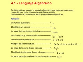 El documento presenta un resumen de expresiones algebraicas en 2o de ESO. Explica el uso del lenguaje algebraico para expresar enunciados matemáticos y de la vida cotidiana de forma sencilla mediante números, letras y operaciones. Luego presenta ejemplos de expresiones algebraicas y conceptos como monomios, polinomios, operaciones con ellos, y factor común.
