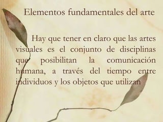 Este documento describe los elementos fundamentales del arte visual como el punto, la línea, el espacio, las posiciones y el color. El punto es el elemento básico que origina la línea al moverse sobre una superficie. La línea dibuja formas guiada por la mano del artista. El espacio se refiere al área donde se ubican las formas visuales. Las posiciones se refieren a cómo se ubican las formas en el espacio. El color es la sensación originada por las radiaciones de los objetos reflejantes sobre los sentidos y el cerebro.