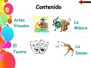 El documento resume diferentes formas de arte, incluyendo artes visuales, música, teatro y danza. Las artes visuales se enfocan en creaciones visuales como pintura y fotografía. La música combina sonidos y silencios usando melodía, armonía y ritmo. El teatro representa historias usando discurso, gestos, escenografía y música. La danza ejecuta movimientos del cuerpo al ritmo de la música y puede ser artística, de entretenimiento o religiosa.