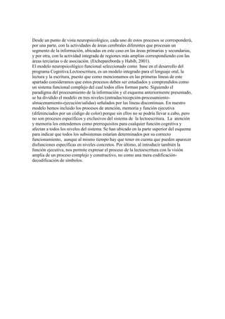 El documento describe el proceso complejo de la escritura, que requiere múltiples procesos cognitivos como la planificación, la construcción de estructuras sintácticas, la selección de palabras y los procesos motores. También compara la escritura con el habla, señalando que ambos procesos comparten códigos pero la escritura es más elaborada y pensada. Finalmente, presenta un modelo neuropsicológico funcional de la lectoescritura que incluye los principales módulos y procesos cognitivos involuc