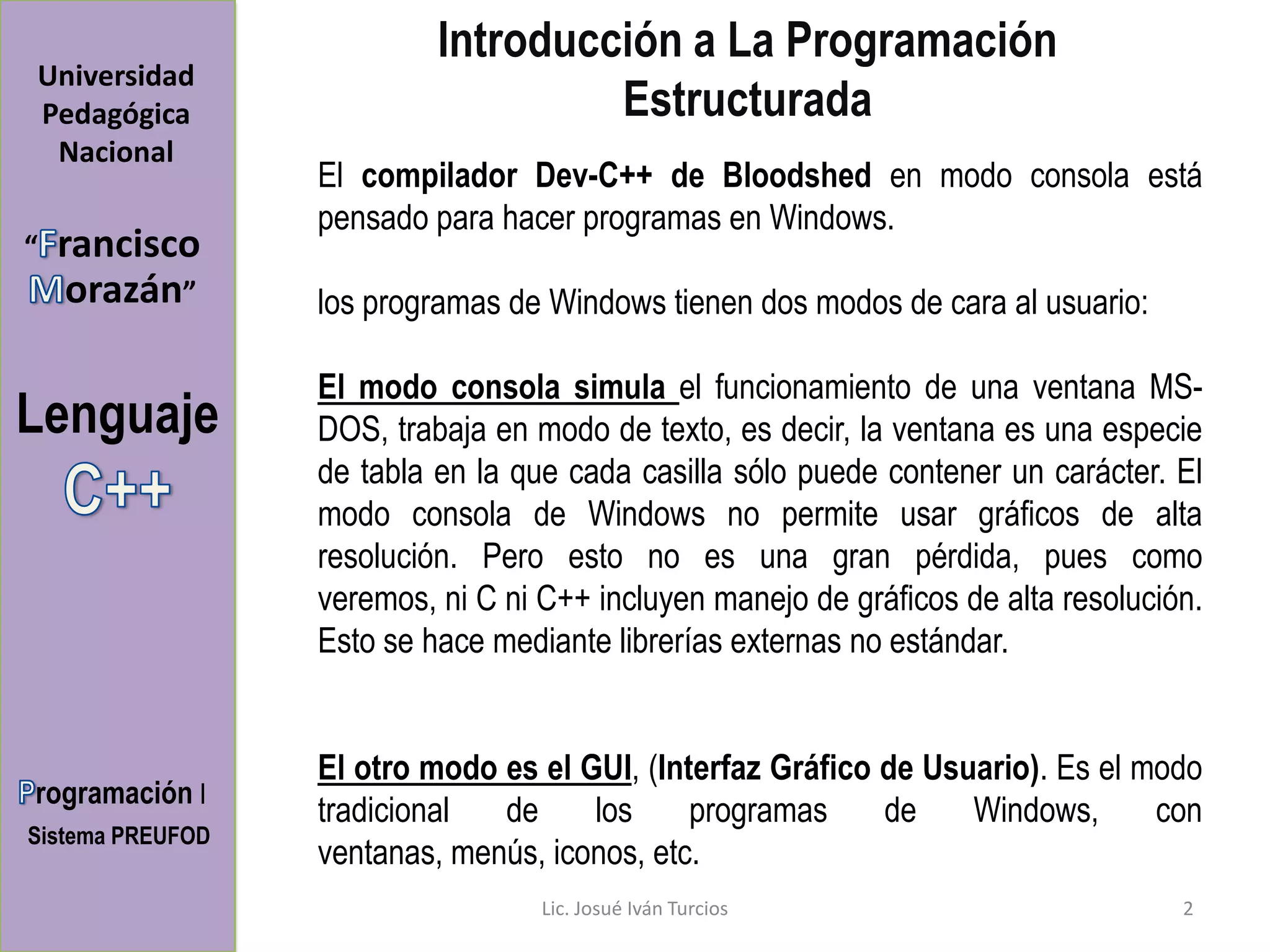 El documento presenta una introducción al lenguaje de programación C++. Explica que el compilador Dev-C++ se puede usar para crear programas en modo consola de Windows, el cual simula una ventana DOS y solo permite texto sin gráficos. Luego define conceptos básicos como ficheros fuente, código fuente, ficheros objeto, código objeto y compiladores. Finalmente menciona que C++ permite crear todo tipo de aplicaciones como sistemas operativos, juegos, etc.