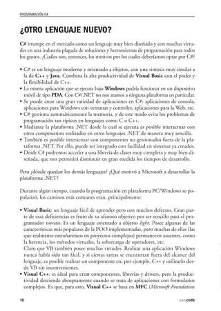 Este documento presenta una introducción al lenguaje de programación C# y a la plataforma .NET de Microsoft. Explica las motivaciones para el desarrollo de C# y .NET, como abordar las limitaciones de lenguajes previos y aprovechar nuevas plataformas. También compara C# con lenguajes como Visual Basic, C++ y Java, resaltando sus características y ventajas. Finalmente, proporciona una primera mirada al entorno de desarrollo Visual Studio .NET.