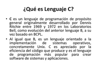 El documento proporciona una introducción al lenguaje de programación C, destacando su origen, características y uso en la creación de sistemas operativos. También aborda la sintaxis de C, sus niveles de programación y el proceso de compilación, así como ejemplos de errores que pueden ocurrir tanto en tiempo de compilación como en tiempo de ejecución. Se concluye con una explicación sobre la importancia de los depuradores en la identificación de errores en el código.