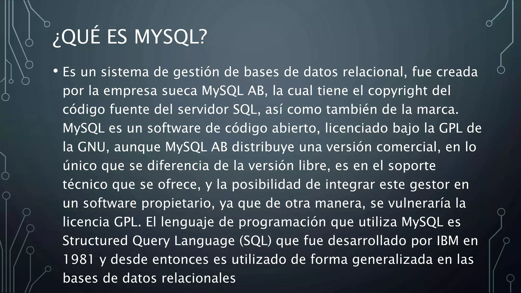 MySQL es un sistema de gestión de bases de datos relacional de código abierto, creado por MySQL AB, que utiliza SQL como lenguaje de programación y está licenciado bajo la GPL de GNU. A pesar de carecer inicialmente de elementos esenciales como integridad referencial y transacciones, se ha vuelto popular por su velocidad, robustez y portabilidad. Entre sus ventajas se encuentran la facilidad de configuración y el bajo costo, aunque presenta desventajas como la falta de documentación en muchas utilidades y su complejidad comparativa.