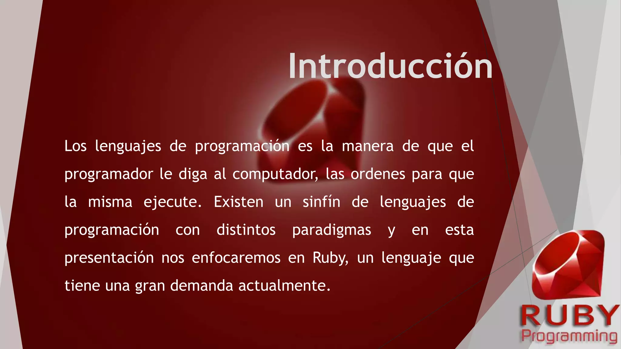 Ruby es un lenguaje de programación interpretado, reflexivo y orientado a objetos, creado por Yukihiro Matsumoto, que combina características de otros lenguajes como Python y Perl. Ofrece una sintaxis clara y permite múltiples paradigmas de programación, incluyendo la orientación a objetos, la programación procedural y la programación funcional. Ruby es especialmente popular en el desarrollo web gracias a su framework Ruby on Rails, y es notable por su flexibilidad y facilidad de uso para programadores con experiencia previa en lenguajes similares.