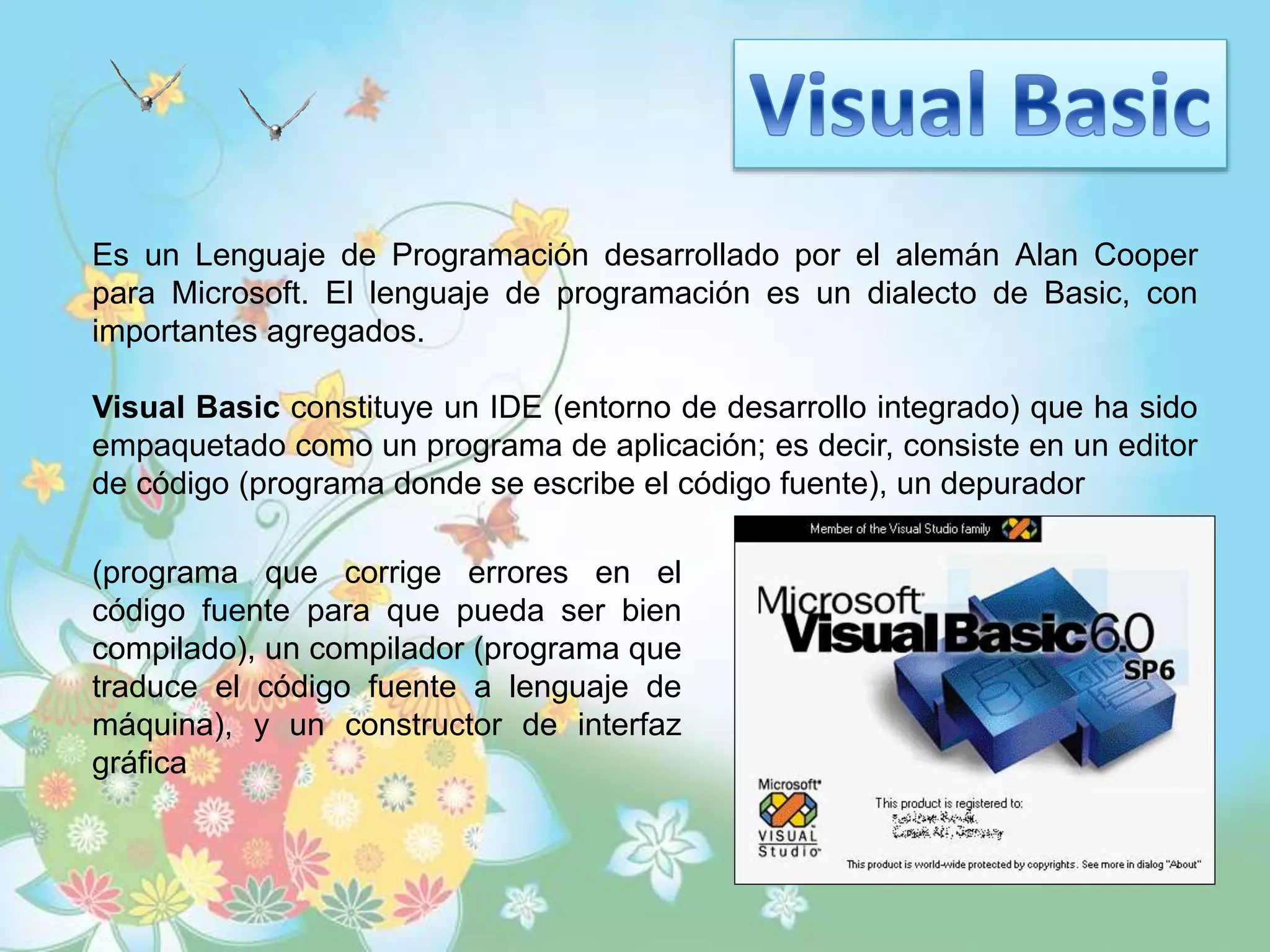 Visual Basic es un lenguaje de programación y entorno de desarrollo integrado creado por Microsoft. Es un dialecto del lenguaje BASIC con agregados que permiten desarrollar aplicaciones de escritorio con interfaz gráfica de usuario. Visual Basic incluye herramientas para escribir código, depurar errores, compilar y crear interfaces gráficas.