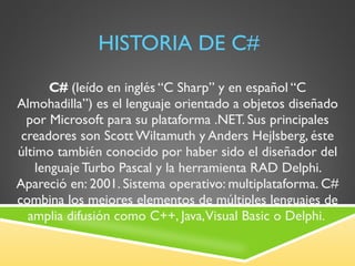C# es un lenguaje de programación orientado a objetos diseñado por Microsoft para su plataforma .NET. Tomó las mejores características de lenguajes como C++, Java y Visual Basic, y agregó características como seguridad de tipos, gestión automática de memoria y compatibilidad con múltiples plataformas. C# es el lenguaje nativo de .NET debido a que fue diseñado específicamente para esta plataforma, haciendo la programación más sencilla e intuitiva que con otros lenguajes.