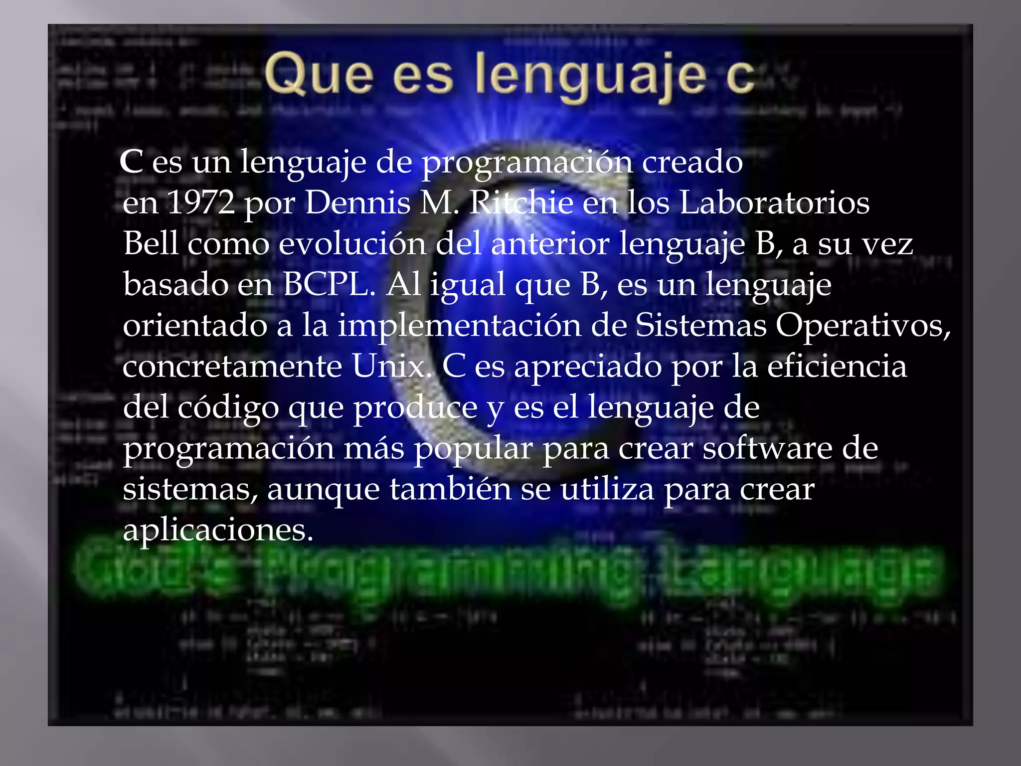 El lenguaje C fue creado en 1972 por Dennis Ritchie en los Laboratorios Bell como evolución del lenguaje B para la implementación de sistemas operativos como Unix. C es apreciado por la eficiencia del código que produce y es el lenguaje más popular para crear software de sistemas. Versiones posteriores como C++ añadieron características de programación orientada a objetos a C.