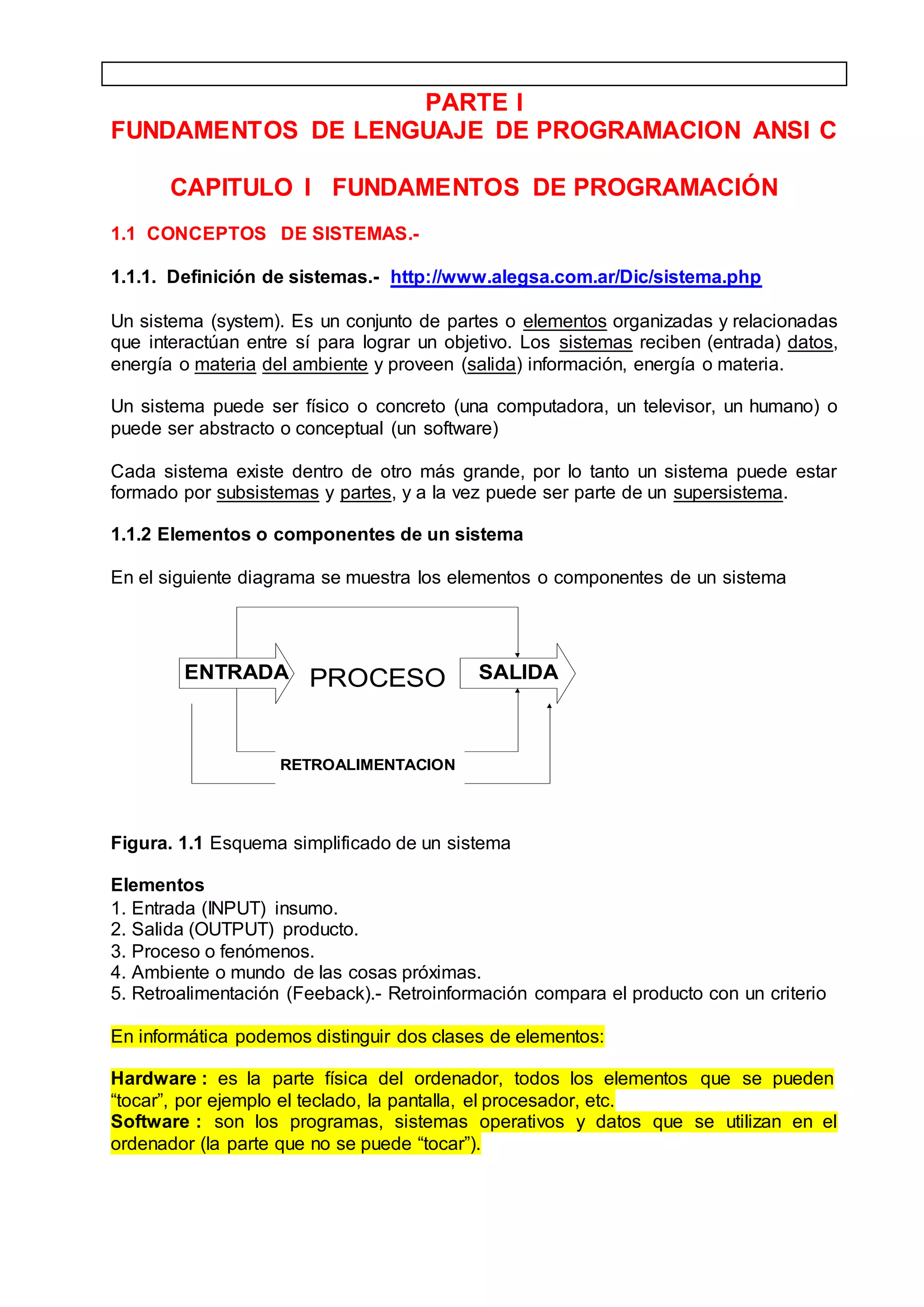 Este documento presenta los fundamentos de programación en lenguaje C. Explica conceptos clave como sistemas, programas, algoritmos y metodologías de programación. Define los elementos de un sistema como entrada, salida, proceso y retroalimentación. Describe diferentes notaciones para representar algoritmos como diagramas de flujo y pseudocódigo. Finalmente, compara versiones del lenguaje C como C estándar, C++, Visual C++ y C#.