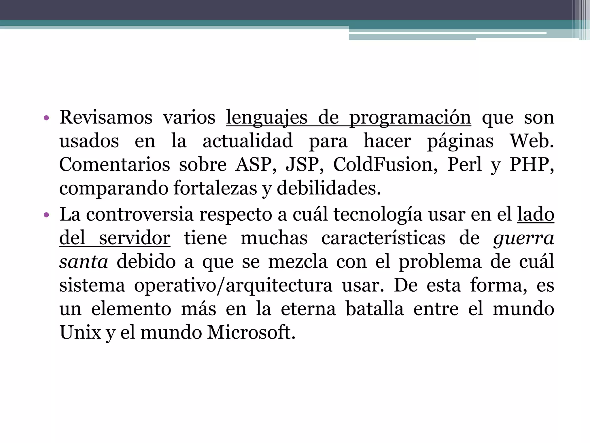 Este documento compara varios lenguajes de programación para el desarrollo web con soporte de base de datos, incluyendo ASP, JSP, ColdFusion, Perl y PHP. Explica las fortalezas y debilidades de cada uno, así como provee ejemplos de código. También discute la controversia sobre qué tecnología usar en el servidor y cómo esto se relaciona con las preferencias de sistemas operativos.
