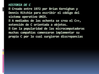 El documento define el lenguaje de programación C y lo clasifica. Fue creado en 1972 por Brian Kernighan y Dennis Ritchie para escribir el código del sistema operativo UNIX. Es altamente transportable, flexible, genera código eficiente y permite realizar muchas funciones con pocas líneas de código. Los lenguajes de programación se pueden clasificar como de alto o bajo nivel, interpretados o compilados, por su objetivo o por si son clásicos, visuales o de internet.