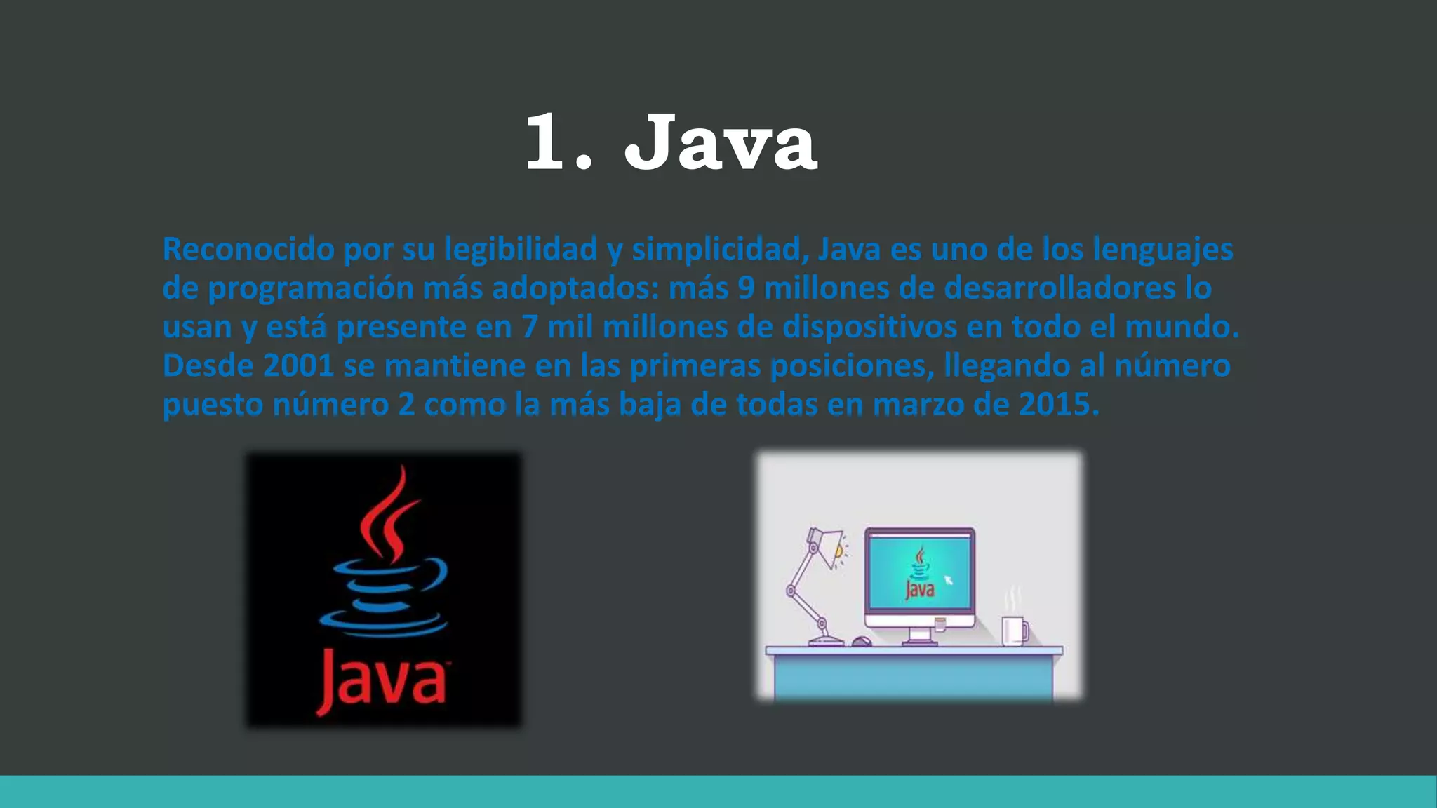 Los lenguajes de programación más populares son Java, C, y C++. Java es uno de los lenguajes más adoptados con más de 9 millones de desarrolladores y está presente en 7 mil millones de dispositivos. C fue creado en los años 1960-1970 y es uno de los más utilizados, particularmente para aplicaciones de escritorio. C++ surge como una extensión de C orientada a objetos.
