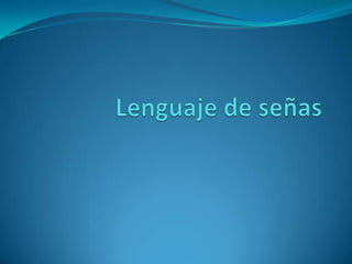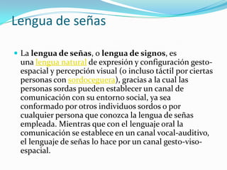 La lengua de señas es una lengua natural de expresión gestual y visual que permite a las personas sordas comunicarse. Tiene su origen en comunidades antiguas y es utilizada tanto por personas sordas como oyentes. Existen varias lenguas de señas diferentes en todo el mundo, con dialectos regionales, y aunque comparten características también tienen variaciones.