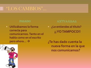 Este documento discute el uso creciente de un "nuevo lenguaje" abreviado en la comunicación escrita, especialmente en chats y mensajes de texto. Se argumenta que este lenguaje reduce la calidad de la comunicación al omitir puntuación, gramática y reglas ortográficas. Si bien es más rápido de escribir, también puede ser más difícil de entender y puede afectar negativamente el desarrollo lingüístico de los jóvenes y la sociedad en general.