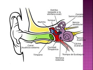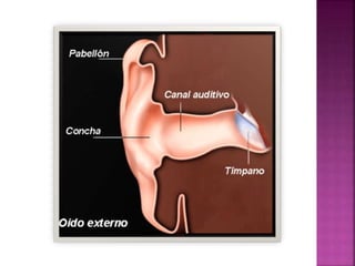 El documento describe la anatomía y función del oído humano, incluyendo el oído externo, medio e interno. Explica los tipos de pérdida auditiva, sus causas, grados e implicaciones. También cubre los enfoques de diagnóstico, tratamiento y rehabilitación para personas con hipoacusia.