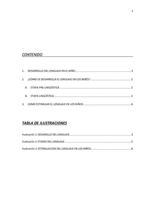 El documento aborda el desarrollo del lenguaje en niños, destacando las etapas pre-lingüística y lingüística en los bebés, y señala la importancia de factores biológicos y ambientales en este proceso. También se proponen estrategias para estimular el lenguaje en los niños, como la comunicación constante y juegos que fomenten el uso verbal. Además, se menciona la relación entre el desarrollo del lenguaje y las habilidades cognitivas en la infancia.