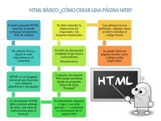 Este documento proporciona instrucciones básicas para crear una página web utilizando HTML. Explica que HTML usa etiquetas entre corchetes para dar formato y estructura a la página, y que incluso un editor de texto simple puede usarse para escribir el código HTML. Además, destaca algunas etiquetas HTML básicas como <title>, <font>, <br>, <h1-6> y <a> que pueden usarse para dar formato a texto, crear enlaces e insertar saltos de línea.