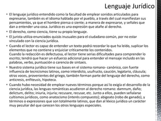 Este documento describe las características del lenguaje jurídico. Explica que el lenguaje jurídico tiene su propia terminología y sintaxis que puede ser difícil de entender para los no expertos. También cubre temas como el razonamiento jurídico, la argumentación jurídica y los posibles vicios en la argumentación. Resalta que el lenguaje jurídico se ha desarrollado a partir de las bases del sistema romano-canónico y ha incorporado términos del latín y griego.