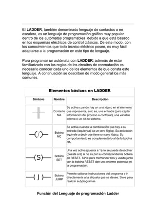 El documento describe el lenguaje de programación Ladder, incluyendo sus elementos básicos como contactos, bobinas y funciones. Explica que el lenguaje Ladder se basa en esquemas eléctricos de control y es fácil de usar para técnicos eléctricos. También describe cómo un PLC lee y ejecuta programas Ladder de forma secuencial línea por línea.