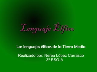 El documento describe los dos principales lenguajes élficos creados por J.R.R. Tolkien para su mundo de la Tierra Media: el Quenya, hablado por los elfos altos, y el Sindarin, hablado por los elfos grises. Explica las características fonéticas y gramaticales de ambos idiomas, incluyendo ejemplos de texto traducido. También resume brevemente la historia y uso de estas lenguas a lo largo de las diferentes edades de la Tierra Media descritas por Tolkien.