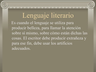 El documento resume los conceptos de lenguaje literario, lenguaje denotativo y connotativo, y las figuras literarias más comunes. Explica que el lenguaje literario se utiliza para producir belleza y llamar la atención sobre sí mismo. Luego describe las diferencias entre lenguaje denotativo y connotativo, y proporciona ejemplos de cada uno. Finalmente, define varias figuras literarias comunes como la metáfora, hipérbole y antítesis, y brinda ejemplos de cada una.