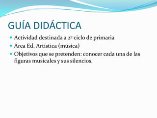 Este documento presenta una guía didáctica para estudiantes de 2o ciclo de primaria sobre lenguaje musical. Explica las partes del pentagrama, la clave de sol y diferentes figuras musicales como la redonda, blanca, negra y corchea junto con sus silencios respectivos, con el objetivo de que los estudiantes conozcan cada una de las figuras musicales y sus silencios.
