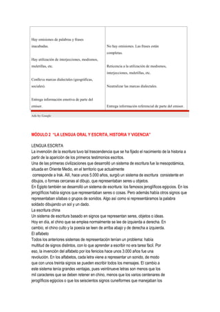 El documento contrasta las diferencias entre el lenguaje oral y escrito. El lenguaje oral se capta a través del oído, permite la interacción entre emisor y receptor, y suele referirse a temas generales. Por otro lado, el lenguaje escrito se capta a través de la vista, no permite retroalimentación del receptor, y suele referirse a temas más específicos. Además, el lenguaje escrito es más duradero y formal que el oral.
