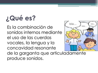 El documento describe las características del lenguaje oral, incluyendo que es efímero, rápido y se ajusta a contextos. También describe elementos de la comunicación oral como el emisor, mensaje, canal y código. Explica trastornos comunes del lenguaje oral como dislalias, disartrias, afasias y tartamudez. Finalmente, cubre conceptos como la voz, tono, ritmo e intensidad en la comunicación oral.