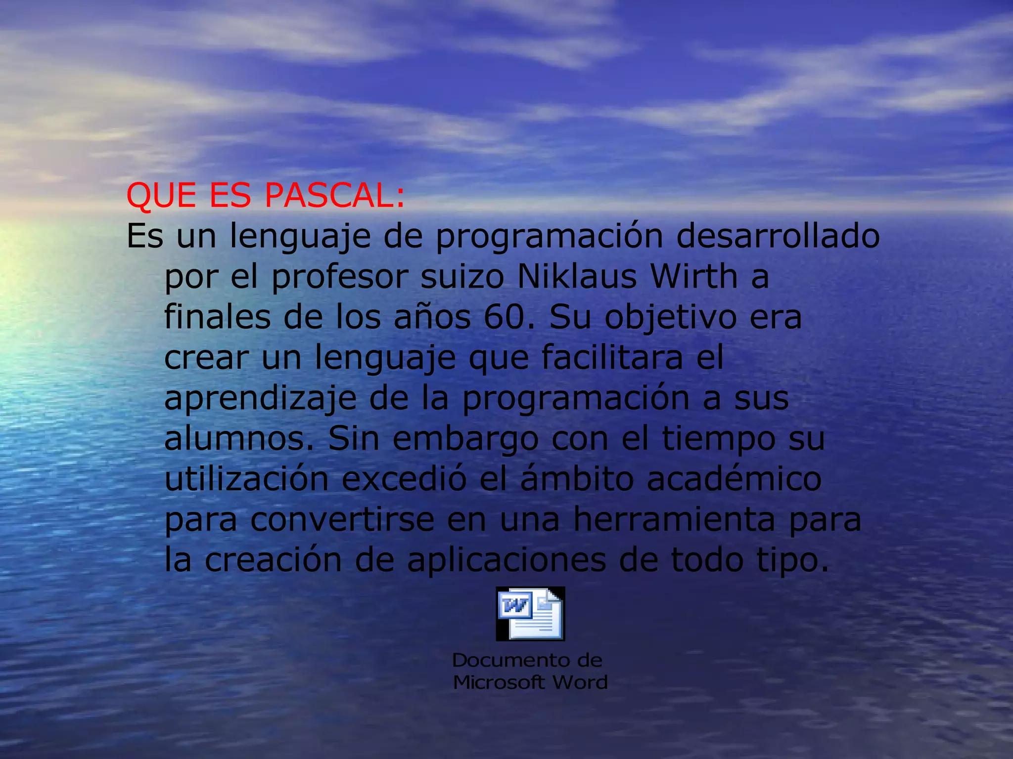 Pascal es un lenguaje de programación estructurado y fuertemente tipificado creado por Niklaus Wirth para facilitar la enseñanza de la programación. Se caracteriza por dividir el código en funciones y procedimientos y requerir la declaración del tipo de datos de las variables. Fue popular en los años 70 y 80 y aunque descendió su uso, sigue siendo una herramienta útil para crear aplicaciones.