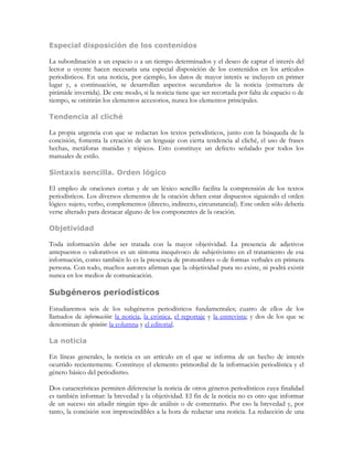 El documento describe los principales aspectos del lenguaje periodístico. Explica que los periodistas deben usar la lengua con corrección y propiedad. También describe las características generales del lenguaje periodístico como la concisión, la disposición de los contenidos y la objetividad. Finalmente, resume los principales subgéneros periodísticos como la noticia, la crónica, el reportaje y la entrevista.