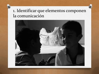 Los elementos clave de la comunicación son el emisor, receptor, mensaje, código y canal. El ser humano es un ser social por naturaleza y usa la comunicación para transmitir emociones, ideas y deseos a otros. El lenguaje visual se expresa a través de imágenes y tiene como objetivo transmitir una información de manera que tenga una sola interpretación, ya sea para vender un producto o servicio a través de la publicidad, o para expresar emociones con fines artísticos.