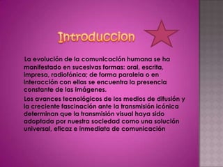 Este documento define el lenguaje visual y sus elementos. Explica que los elementos conceptuales (punto, línea, plano y volumen) no son visibles pero parecen estar presentes, mientras que los elementos visuales (forma, medida, color y textura) son lo que realmente vemos. También cubre los elementos de relación como dirección, posición, espacio y gravedad. Finalmente, discute las finalidades del lenguaje visual y las leyes perceptivas como proximidad, continuidad y resalte.