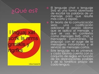 El lenguaje de chat es una forma abreviada de escribir palabras en mensajes para hacerlos más cortos y rápidos. Cada idioma tiene sus propias reglas de abreviación. Originalmente, este lenguaje se usaba para ahorrar en los costos de los mensajes de texto, eliminando letras y usar sufijos. Ahora se usa comúnmente en aplicaciones de mensajería para mantener conversaciones dinámicas a un ritmo rápido, aunque esto a menudo significa ignorar las normas gramaticales.