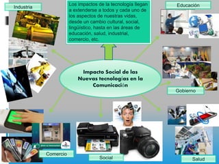 El documento describe los impactos sociales de las nuevas tecnologías en la comunicación. Las nuevas tecnologías han causado cambios culturales, sociales y lingüísticos, y también han impactado áreas como la educación, el gobierno, la salud, el comercio y la industria. Los impactos de la tecnología se extienden a todos los aspectos de la vida.