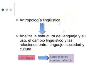La antropología lingüística analiza la estructura y uso del lenguaje, el cambio lingüístico y las relaciones entre lenguaje, sociedad y cultura. La comunicación no verbal como los gestos y expresiones faciales comunican diferencias sociales. El lenguaje hablado y escrito siempre está cambiando y refleja diferencias sociales, mientras que los sistemas de comunicación animal dependen de estímulos y tienen un número limitado de llamadas.