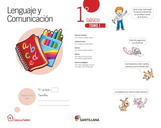 El documento presenta el texto escolar Lenguaje y Comunicación 1o Básico, Casa del Saber. Se organiza en 8 unidades con objetivos de aprendizaje, contenidos introductorios, secciones de lectura, aprendizaje, práctica y evaluación. Cada unidad contiene módulos organizados por habilidades y talleres de producción oral y escrita. El texto fue creado por un equipo de Editorial Santillana y contiene ilustraciones y actividades interactivas.