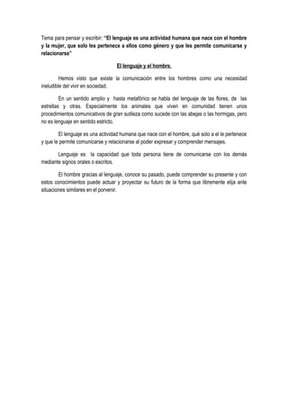 El documento discute cómo el lenguaje es una capacidad única del ser humano que nace con cada persona y les permite comunicarse y relacionarse entre sí mediante la expresión y comprensión de mensajes. El lenguaje humano es distinto de la comunicación animal y permite a los humanos conocer su pasado, entender su presente y planificar su futuro.