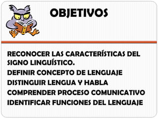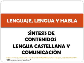 Este documento define los conceptos clave de lenguaje, lengua y habla. Explica que el lenguaje es la capacidad humana de comunicación a través de signos lingüísticos, mientras que la lengua es el sistema de signos específico de una comunidad. El habla se refiere al uso concreto de la lengua en la comunicación. También describe el proceso comunicativo y las funciones básicas del lenguaje como la expresiva, conativa, fática, metalingüística y poética.