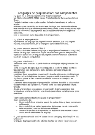El documento discute los componentes de los lenguajes de programación. Explica que Ada Lovelace fue la primera programadora y describió la máquina analítica de Babbage. Luego, Fortran fue el primer lenguaje de alto nivel con impacto comercial. COBOL se creó para ser un lenguaje común para negocios. Los lenguajes de programación consisten en símbolos, reglas de gramática, y semántica que asocia significado a las construcciones del lenguaje.
