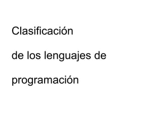 El documento clasifica los lenguajes de programación en tres tipos: lenguaje de máquina, lenguaje de bajo nivel o ensamblador, y lenguaje de alto nivel. El lenguaje de máquina es el primer lenguaje utilizado por las computadoras y utiliza los números binarios 1 y 0, mientras que el lenguaje ensamblador sustituyó al lenguaje de máquina para ser más parecido al lenguaje humano. Los lenguajes de alto nivel, como FORTRAN, LISP y COBOL, permiten al programador escribir