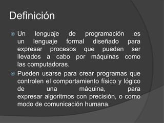 Un lenguaje de programación es un conjunto de símbolos y reglas que permiten crear programas para máquinas, facilitando la expresión precisa de algoritmos y el control del hardware. Existen lenguajes de bajo nivel, altamente dependientes de la máquina, y lenguajes de alto nivel, más cercanos al lenguaje humano y ampliamente utilizados. La implementación puede ser a través de compilación o interpretación, y hay lenguajes populares como HTML, SQL, Java, C, XML y PHP, cada uno con sus características y aplicaciones específicas.
