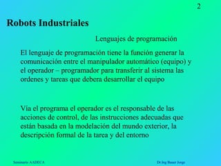 Seminario AADECA Dr.IngBauer Jorge 1 Sistemas Roboticos y Manipuladores Industriales Lenguajes de programación en robótica