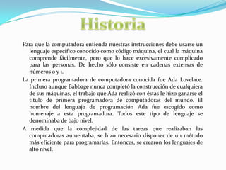 El documento presenta una lista de integrantes de un curso de sistemas y luego resume los diferentes tipos de lenguajes de programación, incluyendo lenguajes de primera, segunda, tercera, cuarta y quinta generación. También discute ventajas y desventajas de cada generación.