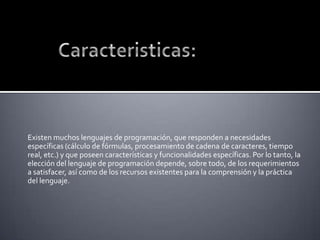 Un lenguaje de programación es un conjunto de símbolos y reglas que definen su estructura y significado para controlar el comportamiento de una máquina. Existen muchos lenguajes que responden a necesidades específicas. Los lenguajes se clasifican en de bajo nivel, que dependen totalmente de la máquina, y de alto nivel, que son más cercanos a los usuarios.