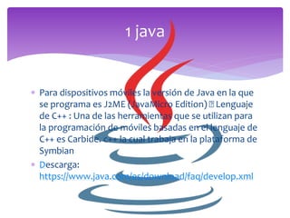 Este documento presenta varios lenguajes de programación para dispositivos móviles como Java, C++, Objective-C, Python y C#. Describe las herramientas de desarrollo integradas más populares para cada lenguaje como Eclipse, NetBeans, Xcode, PyCharm y Visual Studio. También discute brevemente las ventajas y desventajas de cada lenguaje.