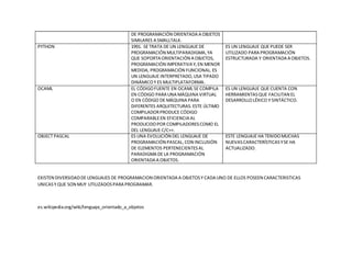 Este documento describe diversos lenguajes de programación orientados a objetos como ABAP, ActionScript, Java, Smalltalk, Ruby, Python, OCaml, Object Pascal y Lexico, mencionando brevemente el año de creación de cada uno y sus características principales. Existen muchos lenguajes orientados a objetos útiles para programar, cada uno con sus propias funcionalidades.