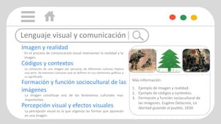 El documento habla sobre lenguajes visuales, imágenes y su comunicación. Explica que en el proceso de comunicación visual, la realidad y la imagen interactúan. También describe que las imágenes son importantes fenómenos culturales y que su uso entre culturas diferentes implica intereses comunes definidos por sus elementos gráficos y significados. Finalmente, discute la percepción visual, tipos de imágenes, y el análisis de imágenes a través de descripciones y interpretaciones.