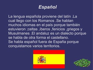 Este documento resume varias lenguas y cómo se desarrollaron. Explica que el español proviene del latín traído por los romanos y que ahora se habla en muchos países debido a la conquista española. También describe brevemente el origen del francés, italiano, alemán e inglés y cómo cada uno evolucionó de lenguas antiguas. Concluye que hablar diferentes idiomas nos permite comunicarnos mejor y apreciar otras culturas.
